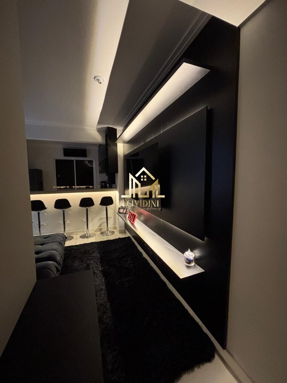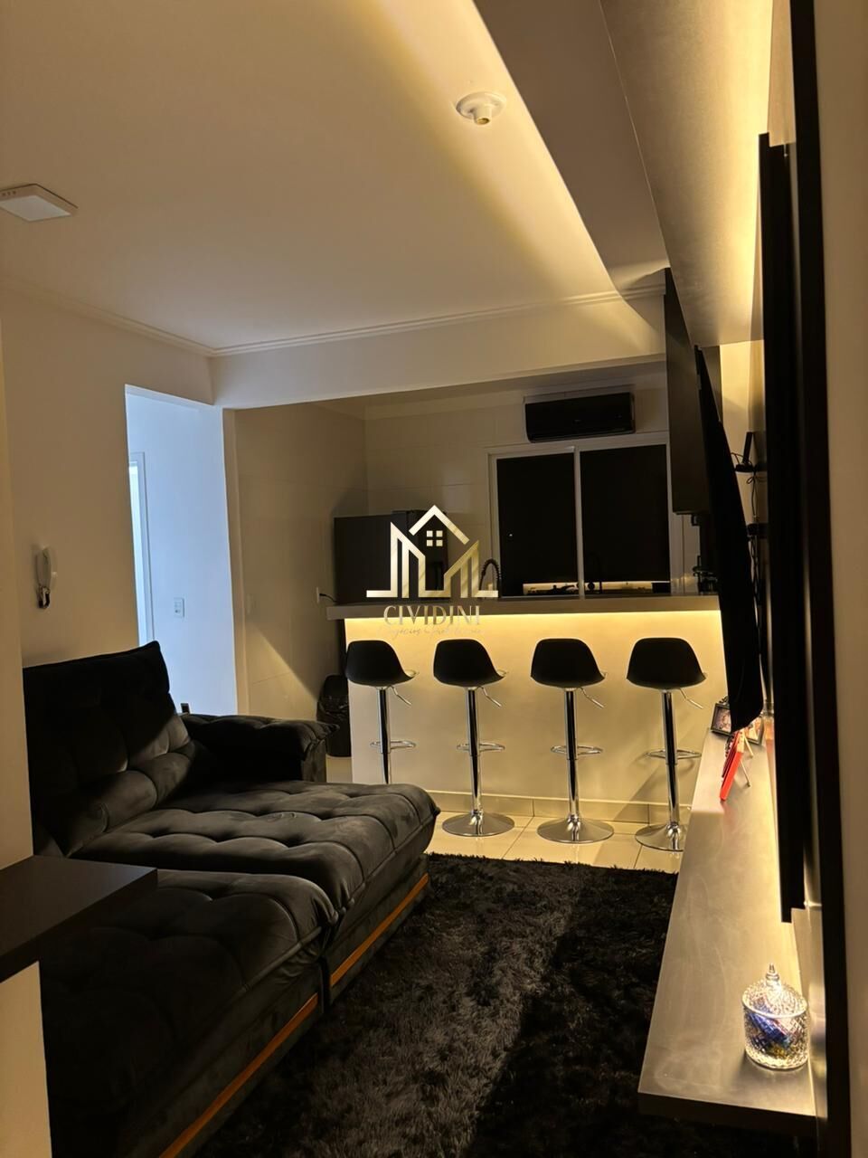 • Sala aconchegante integrada, com painel e balcão iluminado em LED