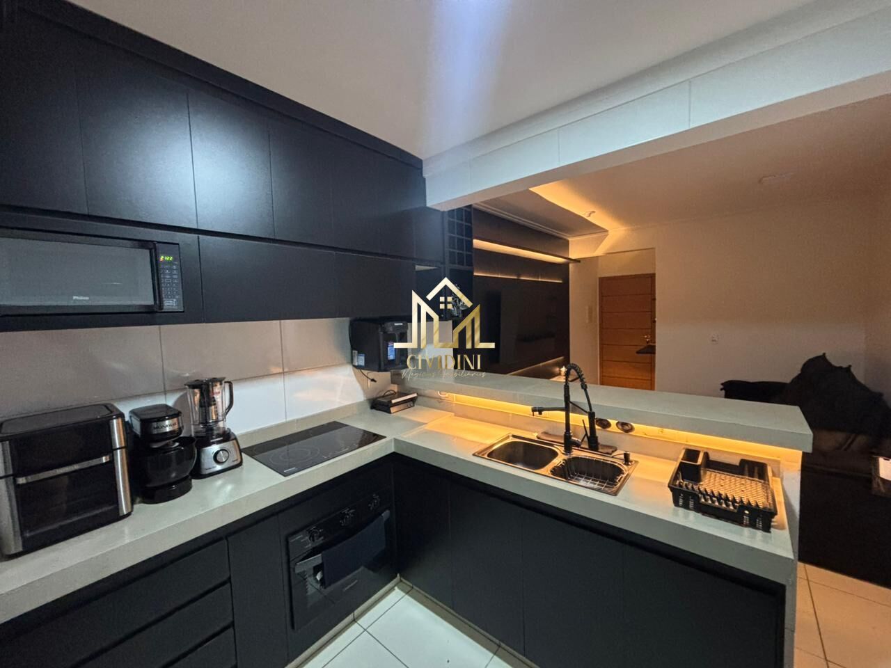 • Cozinha completa com planejados, pia e balcão em porcelanato, iluminação em LED, cuba e torneira gourmet