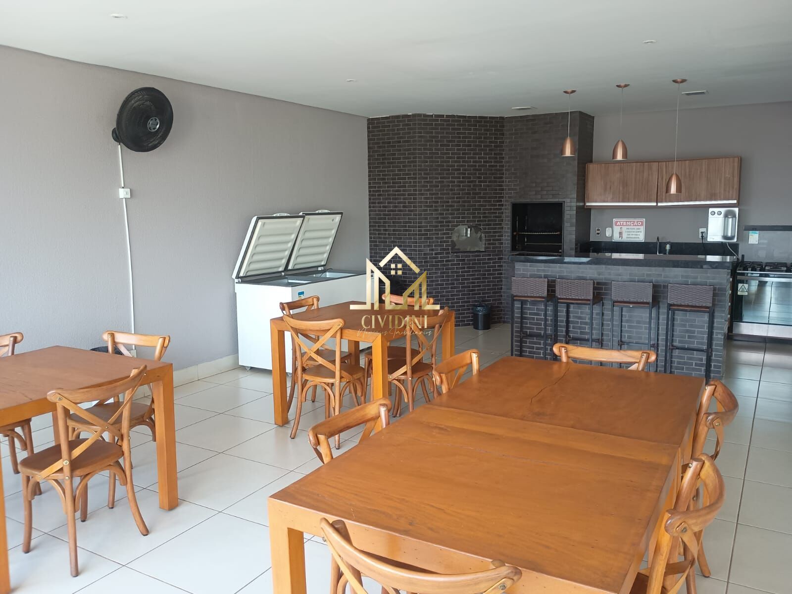 - Salão de festas com área gourmet, freezer, churrasqueira e forno de pizza